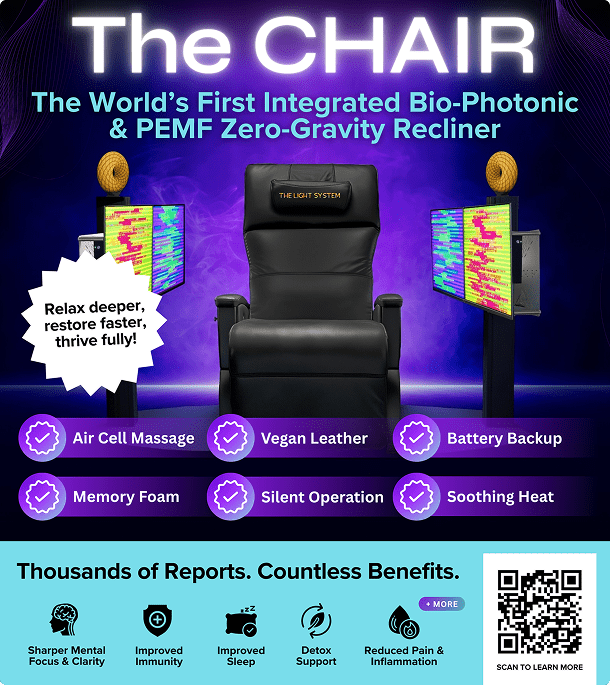 This is the world’s first PEMF and light therapy chair for relaxation, combining a luxurious zero gravity chair wellness experience with built-in massage modes. The targeted and potent massage and light therapy chair experience utilizes four oversized light panels and two PEMF coils, creating a coherent biophotonic therapy chair environment designed for total body wellness.