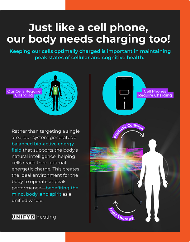 Rather than targeting a single area, our system generates a balanced bio-active energy field that supports the body’s natural intelligence, helping cells reach their optimal energetic charge. This creates the ideal environment for the body to operate at peak performance benefitting the mind, body, and spirit as a unified whole.